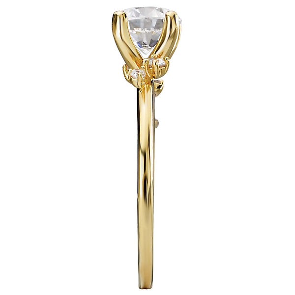 This semi-mount engagement ring has small decoratively placed diamonds along the 14kt yellow gold shank on either side of a setting that will accommodate a 6.5mm round diamond. (D .08 carat total weight) Two matching band styles are available 160136-WY1, 160236-WY2